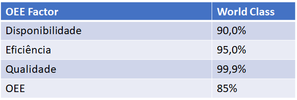 O OEE de classe mundial é um índice utilizado internacionalmente pelas indústrias para benchmarking. Em estudos realizados conclui-se que as empresas mais eficientes a nível mundial possuem os seguintes valores de OEE: